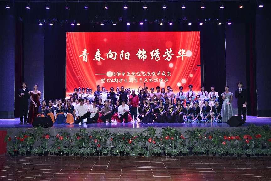 为深入学习贯彻习近平文化思想,积极落实教育部《高等学校课程思政建设指导纲要》等文件要求,bb贝博艾弗森官方网站于2024年12月1日晚,在星湖校区员工活动中心四楼成功举办了“青春向阳锦绣芳华”——舞蹈学专业课程思政成果暨324期员工周末艺术实践晚会。委书记唐建忠,委副书记、经理贺能坤,副经理蒋巧、黎丙松,以及来自星湖校区近2000名师生场观看了本场晚会。晚会由舞蹈学专任教师王爽担任总导演。