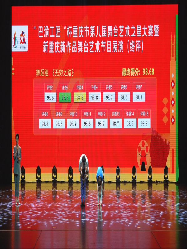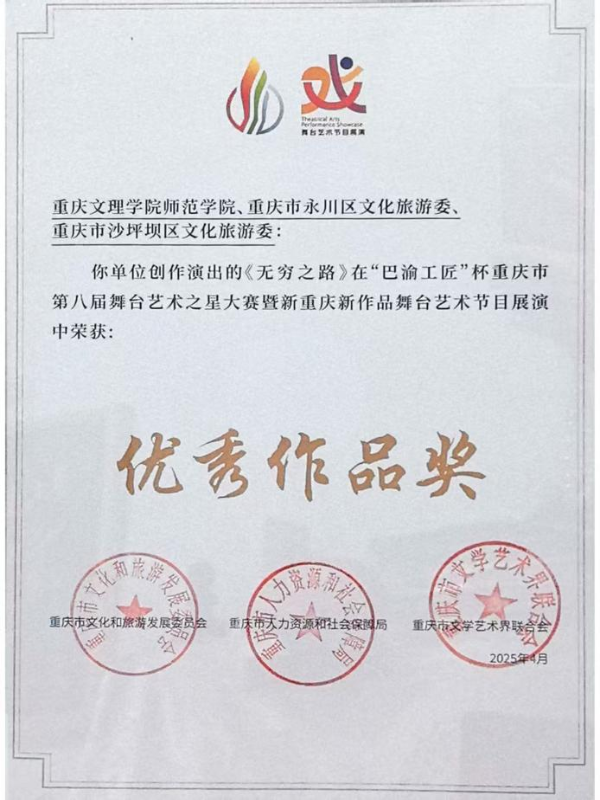 5月8日晚,由市文化旅游委、市人力社保局、市文联联合主办的“巴渝工匠”杯重庆市第八届舞台艺术之星大赛暨新重庆新作品舞台艺术节目展演活动在国泰艺术中心圆满落幕。经过初评、复评、终评等多个环节的激烈角逐,我校bb贝博艾弗森官方网站原创舞蹈作品《无穷之路》从音乐、舞蹈、戏剧、戏曲、曲艺杂技五个舞台艺术门类300余件作品中脱颖而出,进入前十,荣获优秀作品奖。