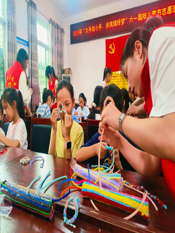 活动伊始,陈润瑶为孩子们送上节日问候并宣布活动开始。活动现场设置了绘画、黏土创作、扭扭棒造型和手链串珠四个主题区域。志愿者们充分发挥师范专业特长,引导孩子们用画笔描绘梦想,用黏土塑造创意作品,用扭扭棒制作动植物造型,用彩珠串成手链。孩子们在志愿者的陪伴下,既锻炼了动手能力和团队协作意识,又通过作品分享感受到鼓励与关注。活动现场欢声不断,一件件充满想象力的手工作品见证着童心与创意的碰撞。